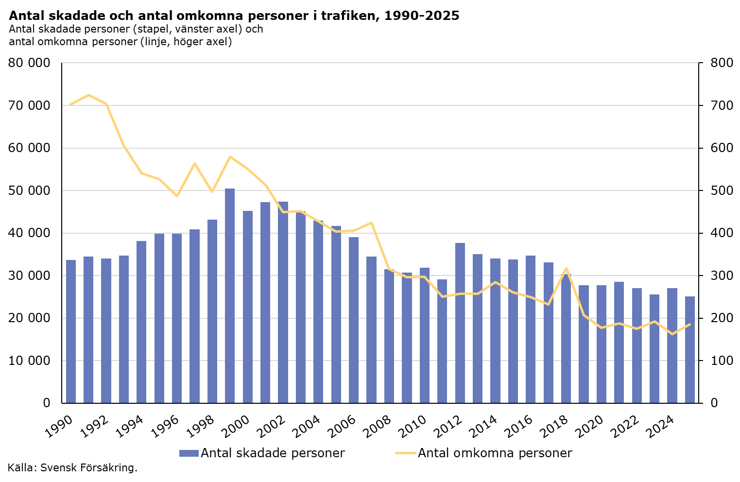 Under 2025 skadades drygt 25 000 personer i trafiken och 185 personer omkom. Det är något färre skadade än året innan men något fler omkomna. Sett över tid visar dock den långsiktiga trenden på en tydlig minskning, framför allt avseende antalet omkomna i trafiken.