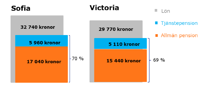 Sofias pension uppgår till 70 procent av hennes slutlön. Victorias pension blir något