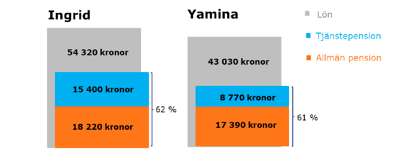 Både Ingrid och Yamina får en pension på drygt 60 procent av slutlönen. Det är