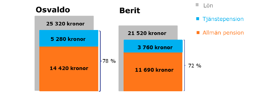 Osvaldos pension uppgår till 78 procent av hans slutlön. Berits pension blir 72